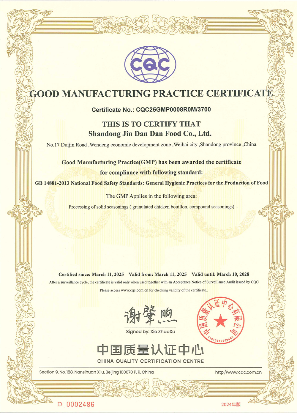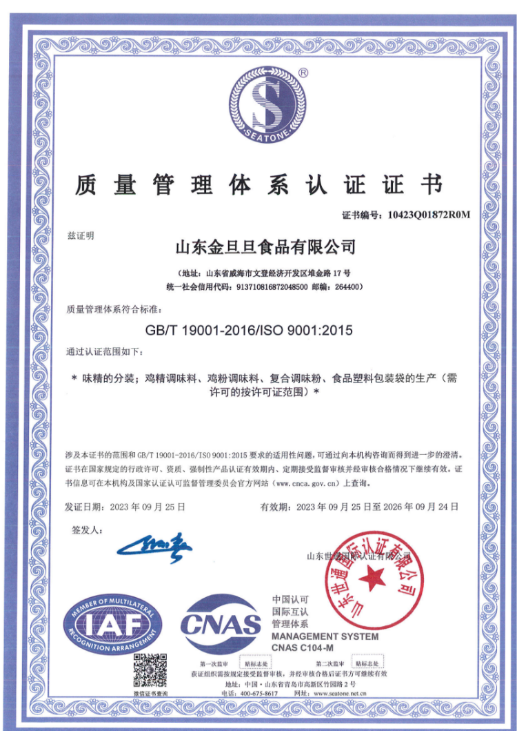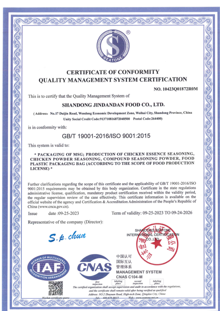 Shandong Jindandan Food Co., Ltd. was established in 1978 and is located in Weihai City, Shandong Province, set in a beautiful environment by the mountains and the sea, covering an area of 19,667 square meters. Since its establishment, the company has been deeply engaged in the condiment field and has over 40 years of production experience. It operates the 'Lily of the Valley' and 'Kunyu Mountain' brands of MSG and chicken essence series products, accumulating a good industry reputation based on solid production foundations. Currently, the company has 130 employees and has formed a stable and efficient production operation team.Over the years, the company has always promoted the corporate spirit of "unity and hard work, pragmatism and efficiency, technological empowerment, and striving for excellence", adhering to the development strategy of "high starting point positioning and low-cost expansion", continuously improving product quality and enhancing corporate management level. Based on consolidating and expanding the existing product market, the company fully relies on its mature sales network and advanced production lines, actively invests financial resources, and focuses on product research and innovation. It has formed a matrix of mid-to-high-end condiment products covering the two major brands 'Lily of the Valley' and 'Kunyu Mountain', including various categories such as MSG, chicken essence, chicken powder, and Flavor King, meeting the needs of different consumption scenarios.In the face of a highly competitive market environment, the company always upholds the purpose of "serving human health and life," strictly organizing production according to national and industry-related standards. With stable product quality, innovative technological applications, and unique flavor characteristics, the company has gained recognition from a wide range of consumers. The company has successively obtained ISO 9001:2000 quality management system certification, HACCP food safety management system certification, and food production licenses issued by the National Quality Inspection Administration, providing a solid guarantee for product quality and safety.In the future, the company will take its past achievements as a new starting point for development, using continuously improving comprehensive strength as motivation to further tap into development potential, fully leveraging its advantages in market layout, technology research and development, and brand building. It will adhere to innovation-driven development and steadily advance towards the goal of becoming a competitive high-quality enterprise in the biotechnology field.
